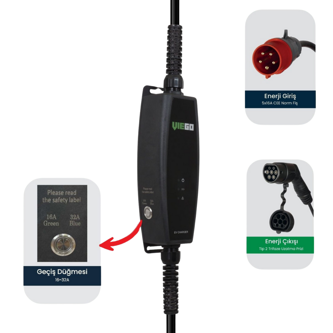 VİEGO Taşınabilir Elektrikli Araç Şarj Cihazı: 11/22KW Tip 2 16/32 Amper